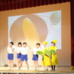 おじいさんが一生懸命お世話をしたかぶは、あまくて大きなかぶに育ちました。得意な運動や音楽の力で仲間を集め、最後にはおおきなかぶを抜くことができました。かわいい1年生が元気いっぱい演じました。