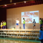 【プログラム6番】日本と台湾の子供たちでジャンケン列車をしました。5年生の子供たちが前へ出てルールを説明しました。計458名で行ったジャンケン列車はとても盛り上がり、長い列車がいくつもできました。日本と台湾の子供たちは、とても近い距離で交流することができ、笑顔が沢山見られました。