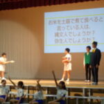 【生活委員会】★あいさつは礼儀正しく ★あいさつの声は元気よく ★あいさつは心をこめて どのようなあいさつがみんなを明るくするのかを、劇とクイズで分かりやすく伝えました。