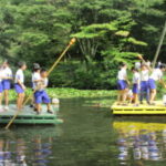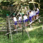 森の動物クイズではグループの仲間と協力して①~⑫のポイントを見付けました。また、池遊びでは、ターザンロープ、池ジャングル、いかだ、ザリガニ釣りをしました。