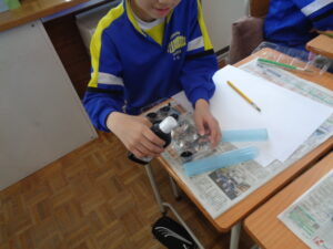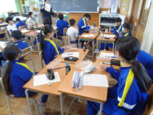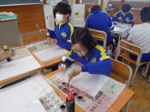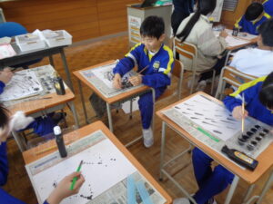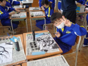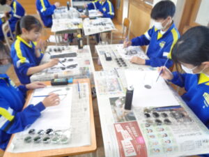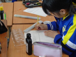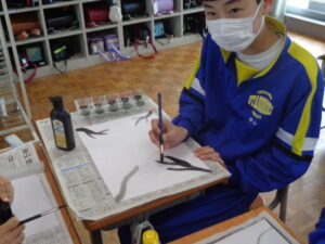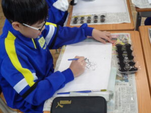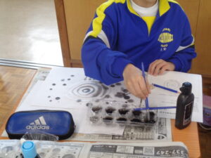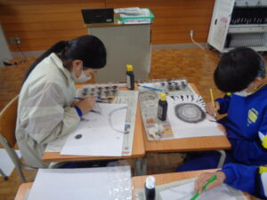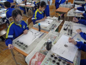 図画工作科では、「墨絵」の学習に取り組みました。自分が今までに感じた様々な気持ちを、様々な線や模様、墨の濃淡で表現しました。これから、互いの作品を見合い、作者の気持ちを感じたりよさを見付け合ったりする予定です。